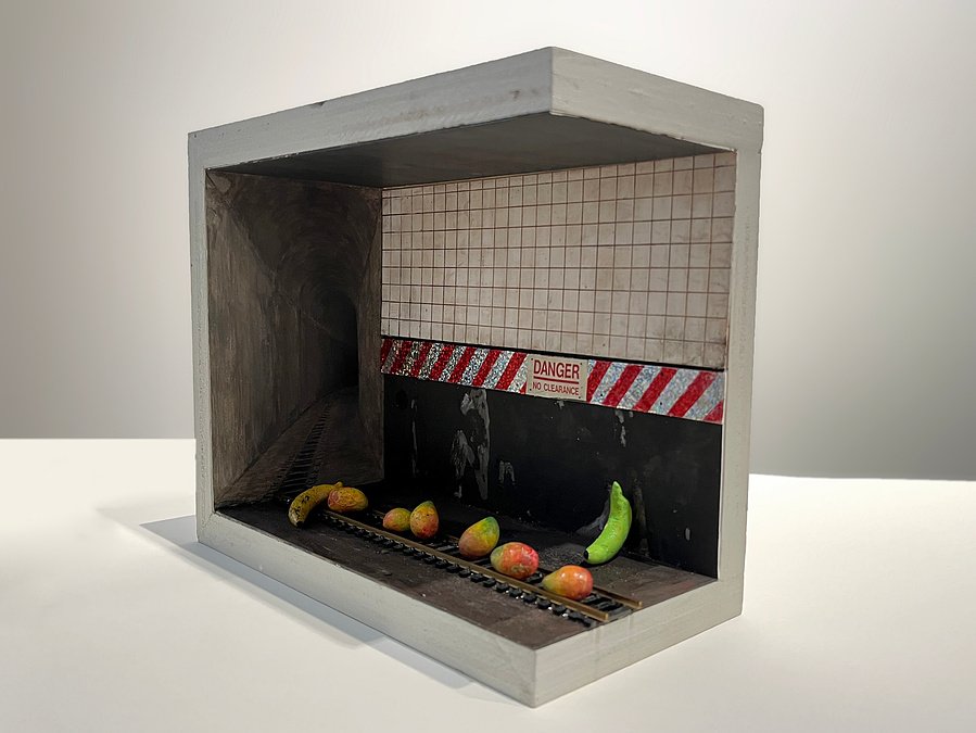 Audrey Rodríguez places fruit on subway tracks, echoing the movement and constraint of street vendors.